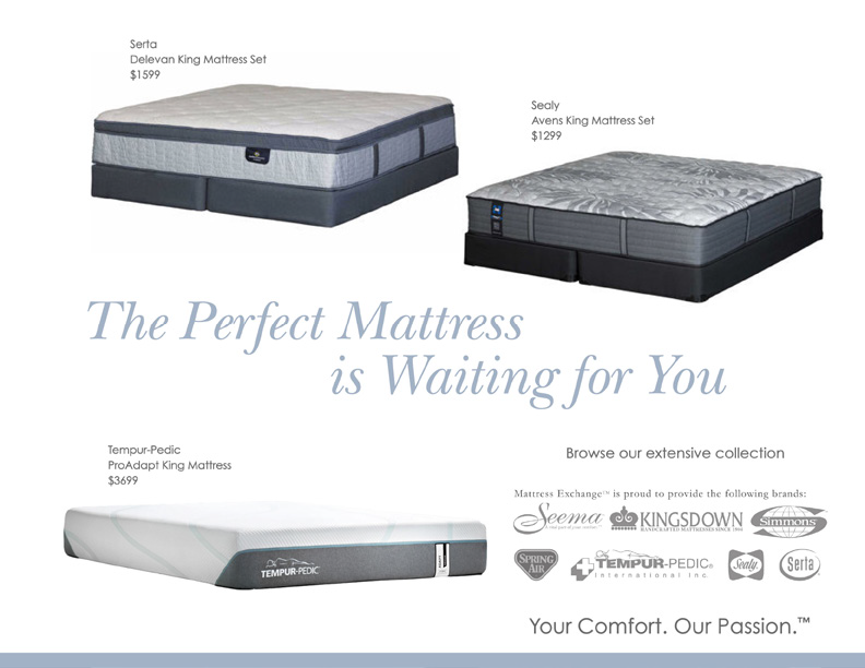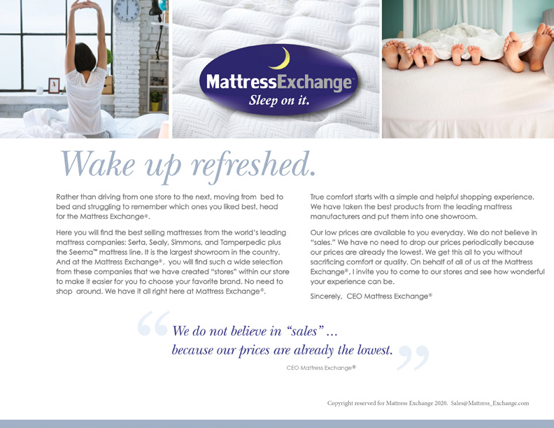 Our low prices are available to you everyday. We do not believe in “sales.” We have no need to drop our prices periodically because our prices are already the lowest. We get this all to you without sacrificing comfort or quality. On behalf of all of us at the Mattress Exchange™, I invite you to come to our stores and see how wonderful your experience can be.